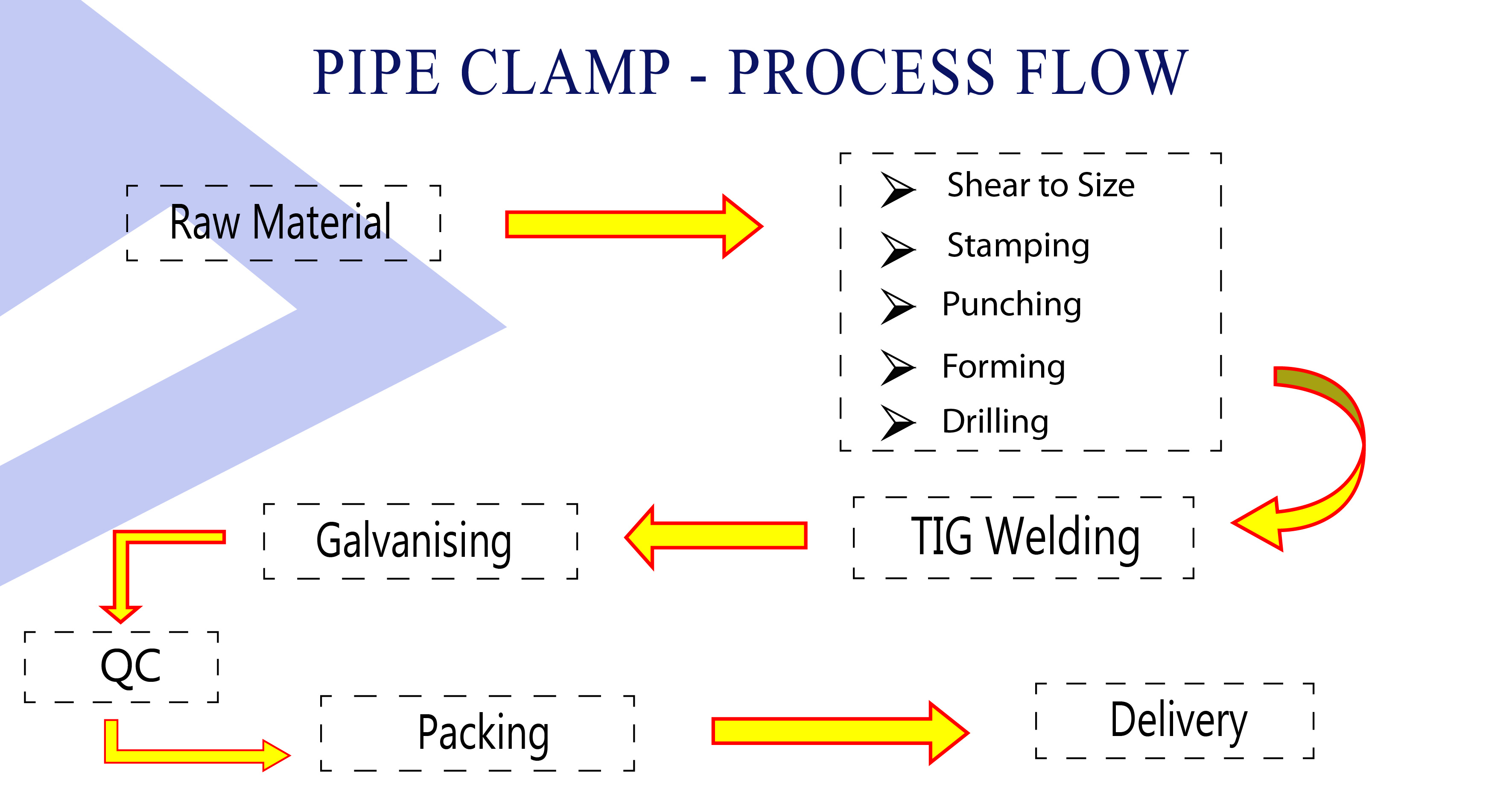 Albe Advance Group, a leading water treatment company in Malaysia, exemplifies efficiency in pipe clamp and hanger manufacturing. Our process begins with meticulously selecting raw materials, followed by precise shear to size, stamping, punching, forming, and drilling. TIG welding and galvanizing further enhance durability. Each product undergoes rigorous quality control checks to meet our high standards. Finally, expertly packed, the clamps are swiftly dispatched for delivery.